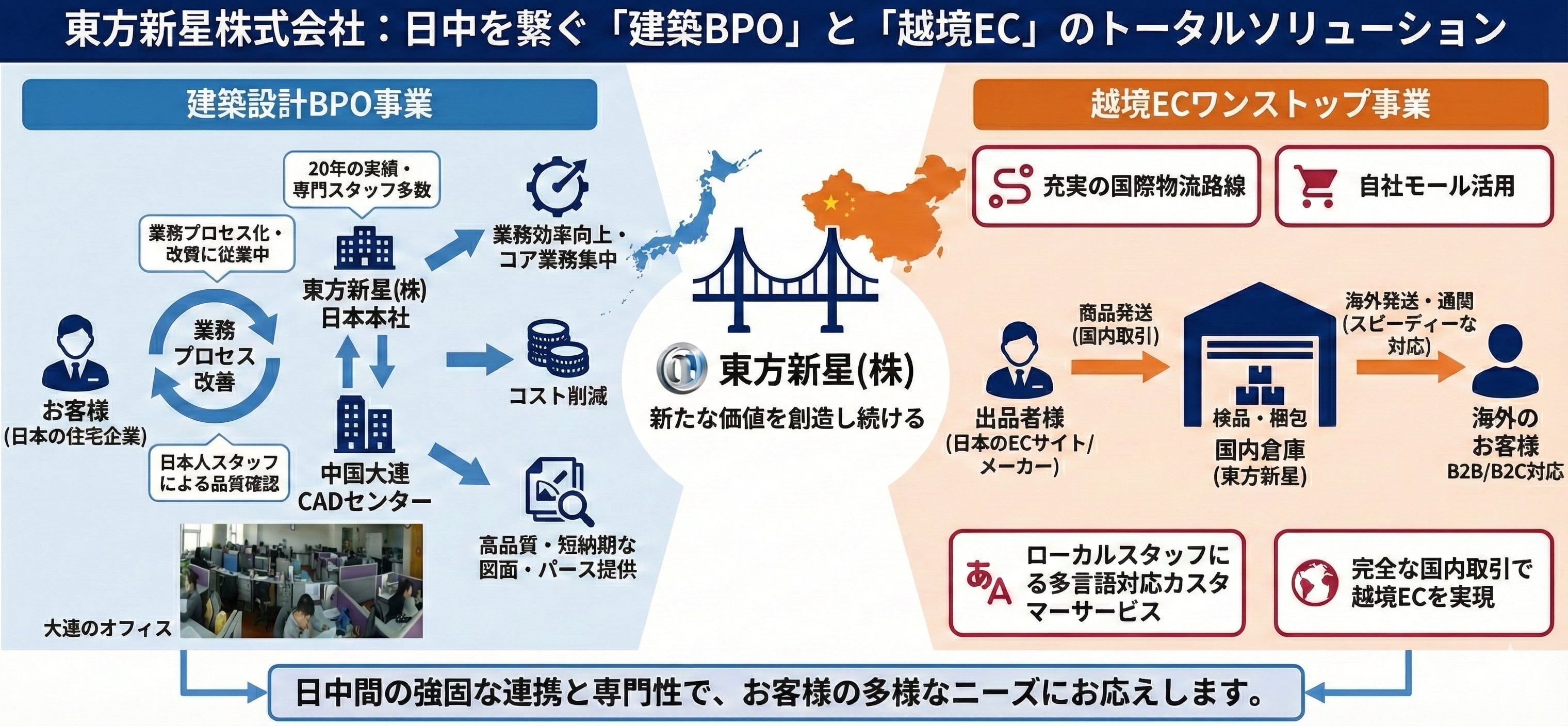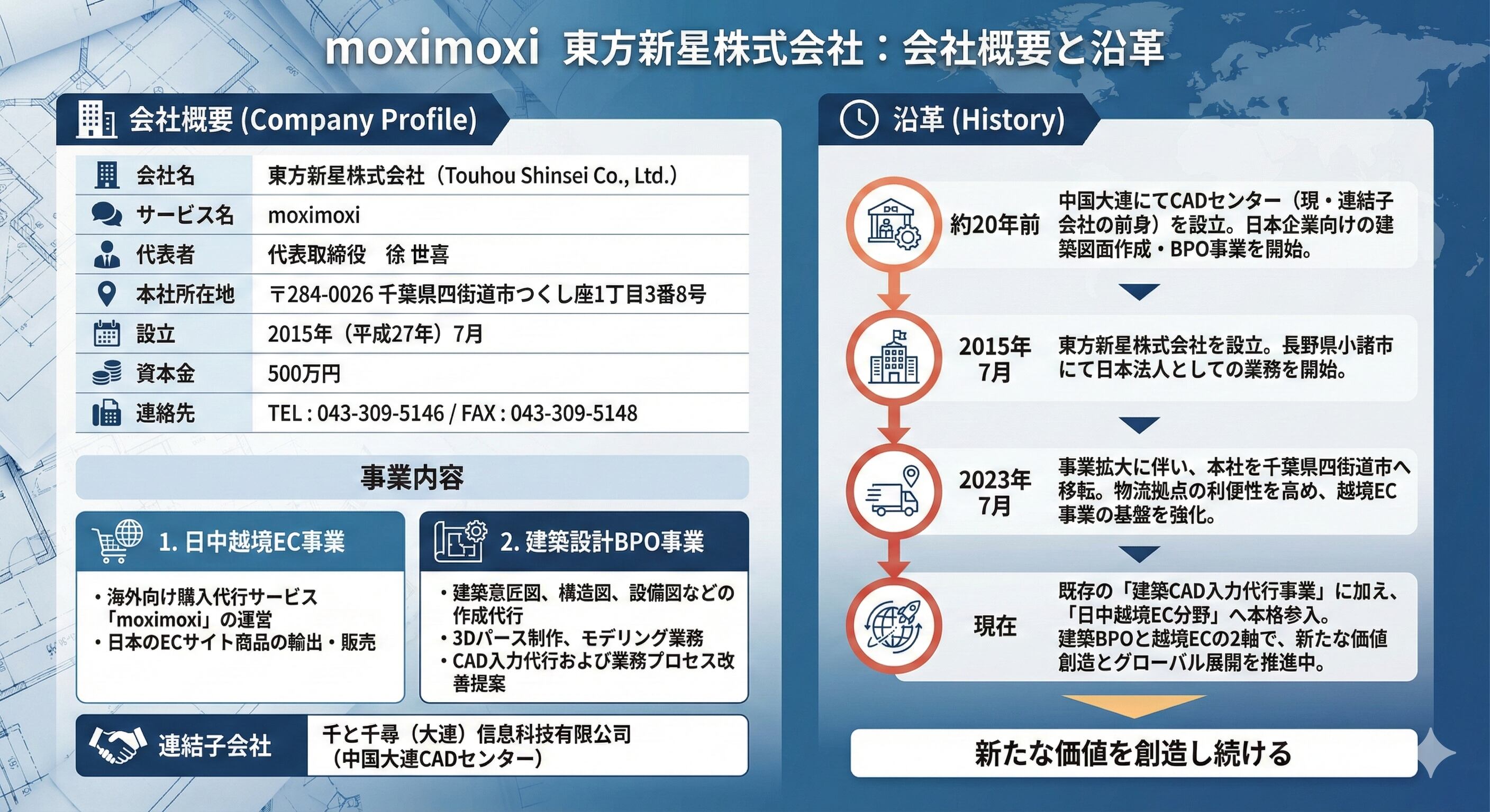 moximoxi(東方新星株式会社)では、「日本の価値を世界へ」をテーマに、建築設計支援とグローバル物流にかかわる業務を多角的に展開しております。