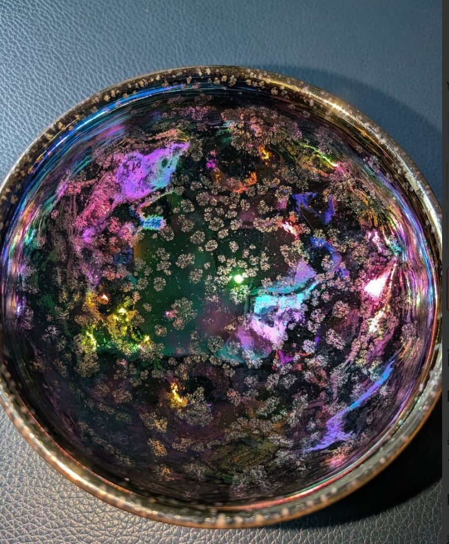 黒い釉薬の表面に、瑠璃色や虹色の光彩を放つ星のような斑点が現れる神秘的な茶碗で、「宇宙」にも例えられます。